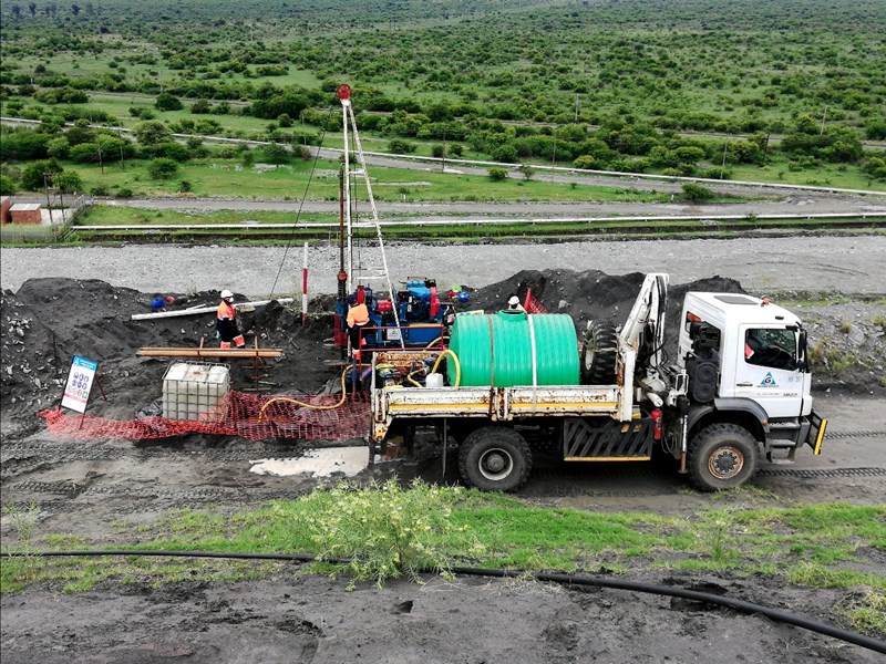 On this particular project, the team faced the challenge of getting the YWE D90 drill rig and the equipment to the top of the tailings dam. The larger area at the top of the dam was inaccessible for the 4 x 4 truck due to the wet nature of the soil. Because of the constant depositions taking place at the tailings dam, the soil was too loose for the truck to drive on. Considering that these deposits are wet, it would have been too risky to drive the truck on this surface as there was a high probability that the truck will get stuck. Should a situation like this occur, it would cause a complete shutdown of the site and it would require the operations staff to assist with getting the truck free, which could take days if not weeks to resume the project. This is a costly delay that the Geomech Africa staff wanted to avoid at all costs. As a solution, Spha Luthuli and Allen Netsianda and their teams were able to track the truck to the safest location nearest to the drill location where they then manually carried all the equipment to the work area. Luckily, the track-based YWE D90 drill rig was able to navigate through the wet areas at the top of the dam with ease and the team could conclude the work at those drill locations. In addition to the wet nature of the site, the increase in rainfall in the area exasperated the access issues on the site. However, with sufficient planning and correct equipment and resource allocation, the team was able to comfortably navigate the difficult conditions on-site without any unnecessary issues.