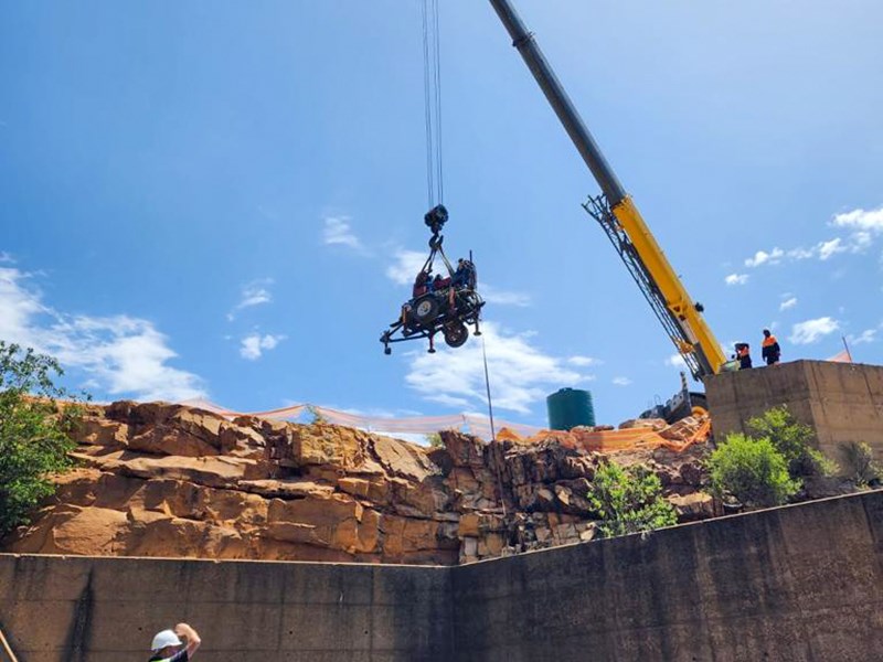 What we thought would be our last challenge was to get the drill rigs down into the bottom of the stilling pond. This area was however not concreted but rather a natural riverbed with boulders and mud making access extremely difficult. The only solution was to call on the excavator and a smaller 20-ton mobile crane to assist.