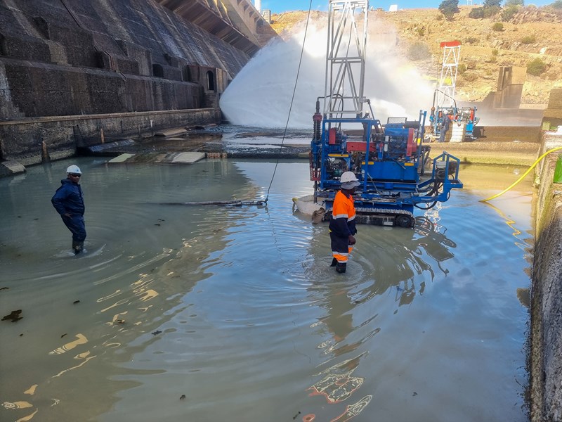 The requirement was simple, fourteen boreholes were to be drilled in the Apron at the foot of the dam wall. Not so simple it would seem, as the Apron has elevated platforms to the West of the wall, a large stilling pond at the foot of the wall, and a Hydropower plant to the East of the wall. All of which are surrounded by retaining walls and the outflow into the local stream.