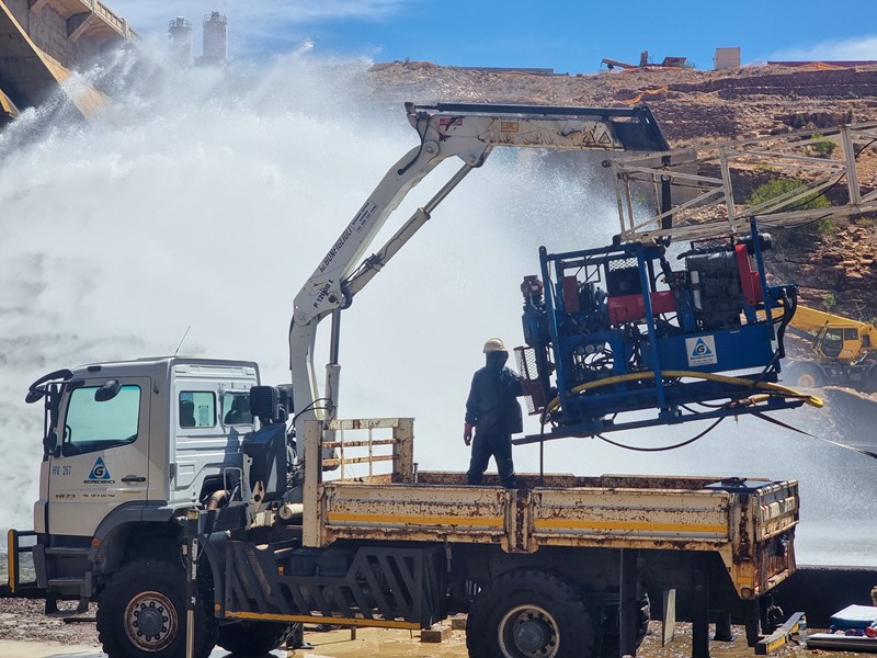 The next challenge would require that we mobilized another of the larger drill rigs and our MERC 4x4 Crane truck carrying all the equipment through the turbulent outflow of the hydropower plant and through the 1.50m high retaining wall. The task required the use of a 30-ton excavator to build a road through the outflow area as the turbulent water had created deep channels. Once the road was completed the 30-ton excavator had to raise the four 2.50m long concrete beams to allow our drill rig & truck through, all of which had to be done as fast and as safely as possible to avoid delays and downtime of the hydro plant. The drill rig tracked itself across the levelled area and onto the Apron with the MERC 4x4 Crane truck following. Once the truck had been off-loaded, it returned to the loading area while the excavator replaced the concrete beams stopping the outflow water from flooding the Western part of the Apron. Fortunately, the various platforms on the West had concrete ramps between them which allowed for tracked access from borehole to borehole.