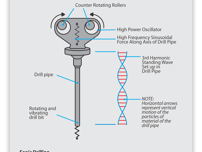 Sonic drilling is a relatively new drilling method and has quickly become a popular choice for geotechnical investigations. It offers several advantages over traditional drilling methods, such as rotary core and percussion drilling. One of the main advantages of sonic drilling is that it is more efficient by drilling up to 2-3 times faster and it uses limited amounts of drill fluids. Sonic drilling can drill through formations much faster than traditional drilling methods. The fluidization of the thin layer immediately adjacent to the length of the drill string, results in a vast reduction in friction and thus increasing penetration rates.