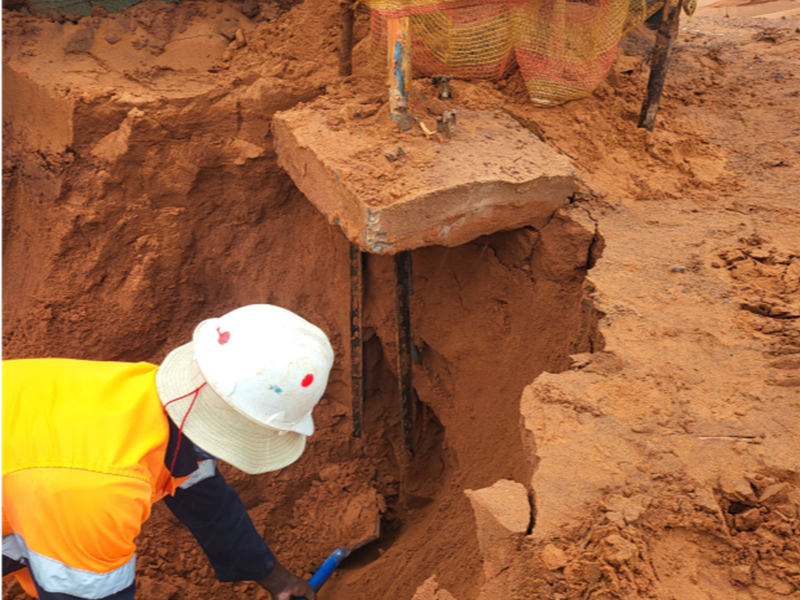 The investigation revealed a blockage in this particular piezometer at 2,9 meters, including the 1,4-meter standpipe. Due to the hardened sand, the Y pole diverted and cut through the PVC piezometer casing. Lowering a camera down the casing confirmed our suspicion. To address this, a TLB was brought in to access the side of the blockage underneath the concrete block. The damaged section of the casing was cut out and replaced, with a slight diversion to avoid the Y pole.