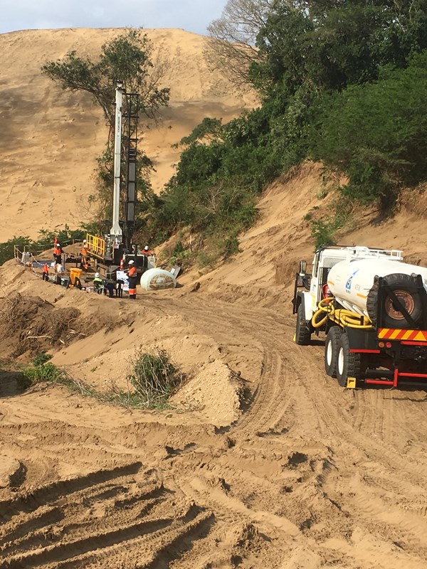 Sonic drilling for Rio Tinto ’s Richards Bay Minerals sands project at the RBM site near Richards Bay. Geomech Africa uses the SDC 450-24 sonic drill rig from Canada to drill the required deep boreholes in mineral sands.